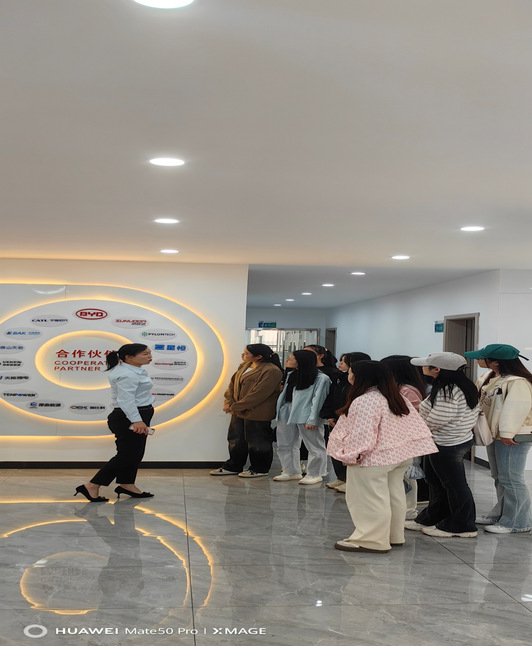 接着,在公司经理的带领下,师生一行参观企业五楼展厅和企业研发实验室,通过观看宣传片以及现场讲解,了解了企业产品的生产工艺、生产流程及公司发展历程,企业方从品牌、品质、价值等多方面展开讲解,为同学们呈上了一堂生动有趣的专业课程。在深入了解江西正拓新能源企业之余也增长了同学们对企业运营与发展的认识。最后,公司经理为此次参观见习做了一个简短的分享和总结,寄语同学们要“脚踏实地做学问、积极向上展思想,方能不负青春韶华”。最后,此次活动在大家的合影留念中结束。