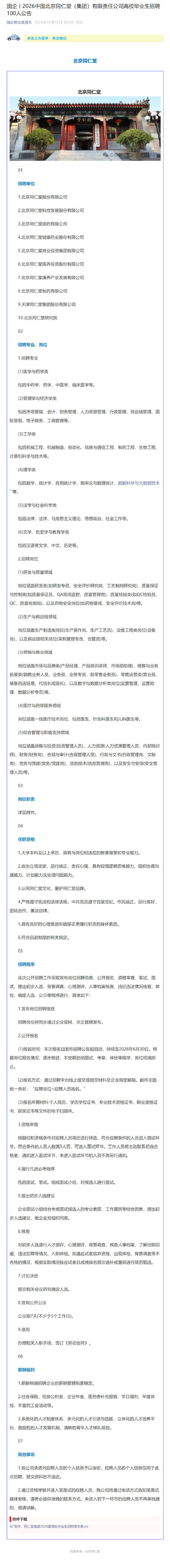国企|2026中国北京同仁堂(集团)有限责任公司高校毕业生招聘 100人公告