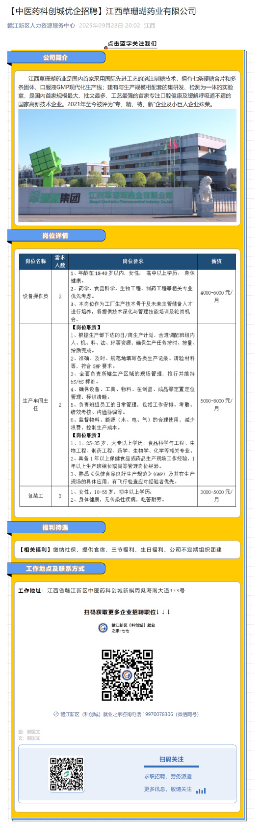 【中医药科创城优企招聘】江西草珊瑚药业有限公司