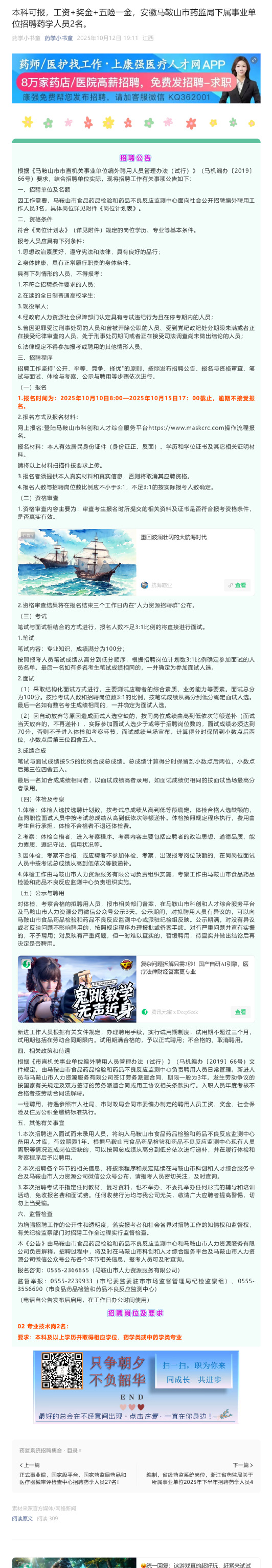 本科可报,工资+奖金+五险一金,安徽马鞍山市药监局下属事业单位招聘药学人员2名。