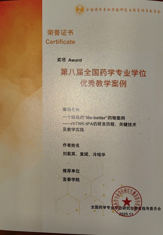 会议同期举行了第八届全国药学专业学位优秀教学案例颁奖仪式,评审结果正式揭晓。药学院刘紫英教授团队报送的《一个经典的“Me-better”药物案例——rhTNK-tPA的研发历程、关键技术及教学实践》案例,在众多参评作品中脱颖而出,荣获第八届全国药学专业学位优秀教学案例成果奖。据悉,该领域全国仅有18项案例获此荣誉,这份奖项是对团队教学成果的高度肯定。该获奖案例以rhTNK-tPA药物研发为核心主线,系统展现了“Me-better”药物的创新路径与关键技术突破,将前沿科研成果与教学实践深度结合,为药学专业学位研究生提供了兼具理论深度与实践价值的教学范本,具有重要的教学示范意义。