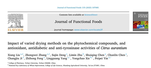 (本站讯)近日,宜春学院药学院杨灵光、尹培培课题组与山东农业大学“泰山学者”解永超副教授合作,在国际知名期刊《Journal of Functional Foods》(中科院二区,IF=4.0)发表题为《Impact of varied drying methods on the phytochemical compounds, and antioxidant, antidiabetic and anti-tyrosinase activities of Citrus aurantium》的研究论文,为酸橙在功能食品与药物开发中的高值化利用提供重要科学支撑。