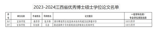 (学生通讯员 罗晶晶 欧阳昱舜)近日,江西省教育厅发布了《关于公布江西省优秀博士硕士学位论文名单的通知》,我院药学专业硕士研究生宋旭娇的学位论文《肠道菌群介导的葛根素抗抑郁效应机制研究》荣获2023年优秀硕士学位论文(导师:马浩),秦莎莎的学位论文《紫杉醇前药自组装纳米粒的构建及抗肿瘤评价》荣获2024年优秀硕士论文(导师:张兵锋)。