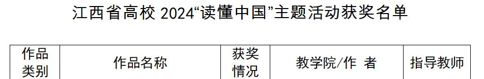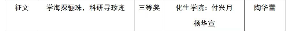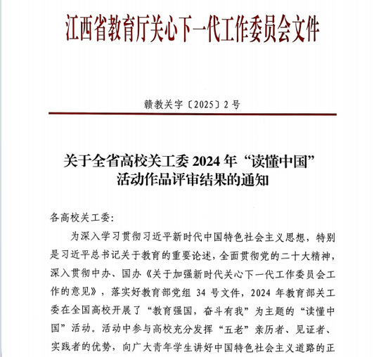 (学生通讯员 何福乐 刘慧敏)近日,江西省教育厅关工委发布了全省高校关工委2024年“读懂中国”活动作品评审结果。我校报送的征文作品有3项获奖,其中我院党委副书记陶华蕾指导22应化班付兴月、22药学一班杨华宣两位学子撰写的征文作品《学海探骊珠,科研寻珍迹》荣获三等奖。