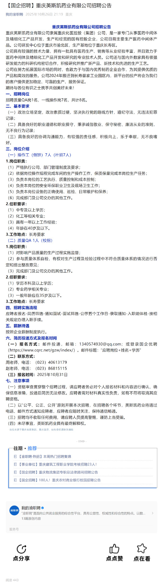 【国企招聘】重庆英斯凯药业有限公司招聘公告